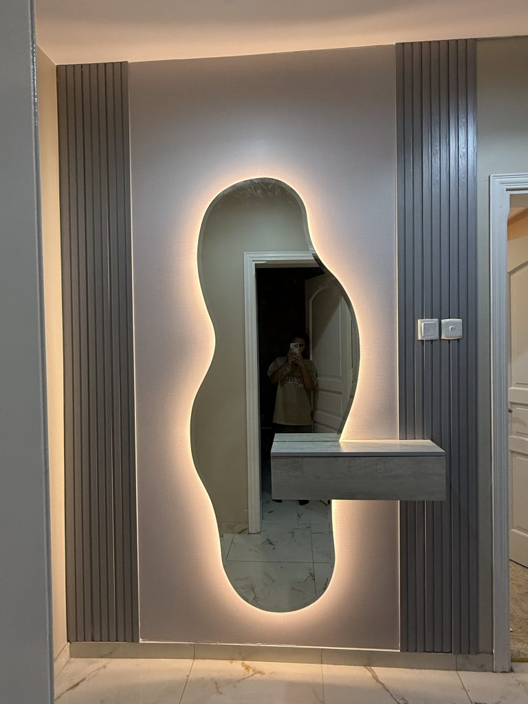 نُصمّم لك مداخل راقية تجمع بين الفخامة والعملية، حيث يتكوّن هذا المدخل من مرايا فاخرة تضيف اتساعاً وبُعداً بصرياً، وألواح الشيبورد التي تمنح لمسة عصرية أنيقة، مع تنسيقات بديل الخشب ليكتمل الطابع الدافئ والراقي للمكان.